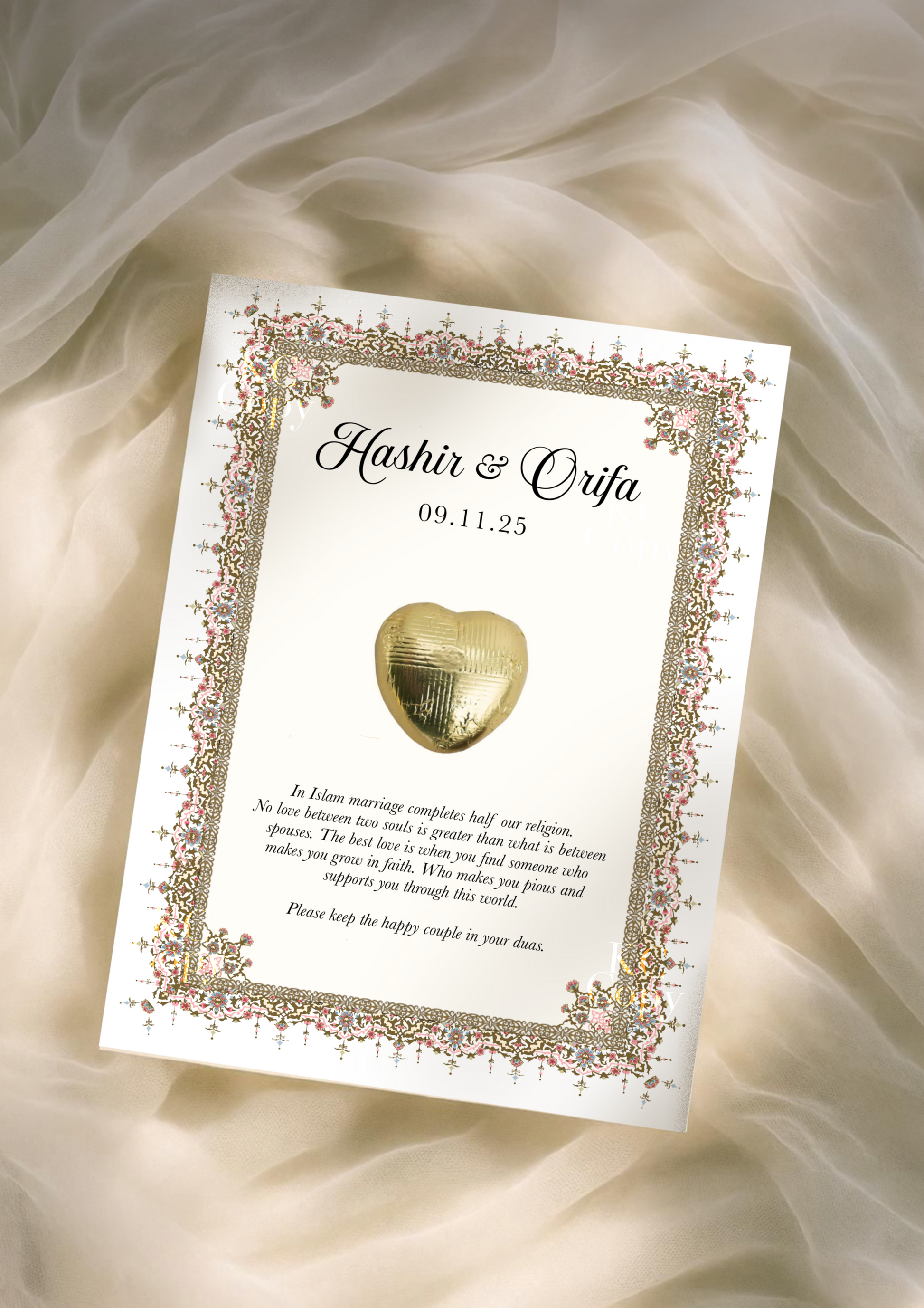 upon embarking the excitement of finding your perfect wedding treats, look upon these little favours that your guests will surley enjoy. Adorned with delicate floral detail around the border, a message to honour the couple to be wed, allow the whisper of duas travel around the room thatll be heard in the heavens above.