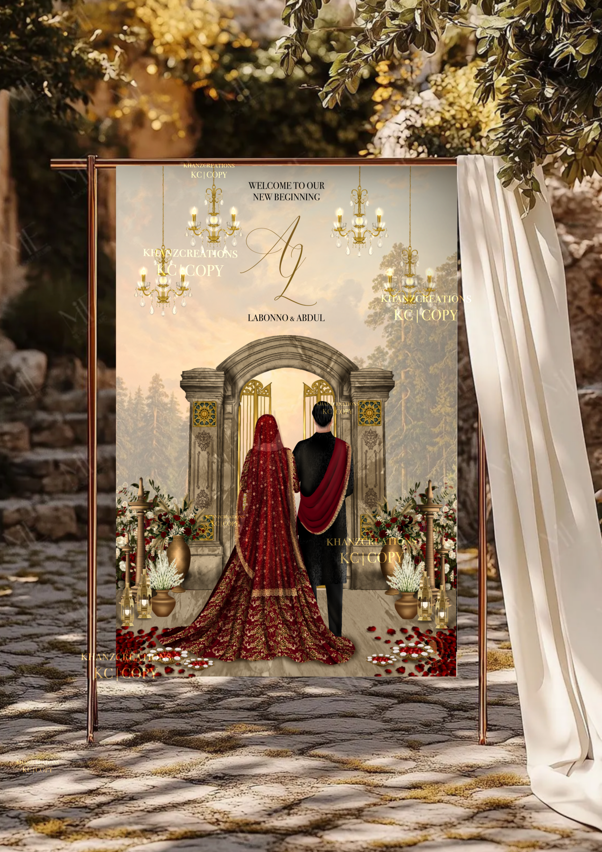 Picture a Nikkah/Wedding welcome board as a magical gateway to a fairytale celebration. It's like a charming storyteller, whispering tales of love and togetherness as you approach. Adorned with vibrant elegant designs, delicate flowers, and shimmering accents, it's a visual masterpiece that sings with romance and enchantment. This captivating board not only greets you but embraces you in the promise of a day filled with magic and unforgettable moments, where every detail whispers of a love story waiting to unfold.
