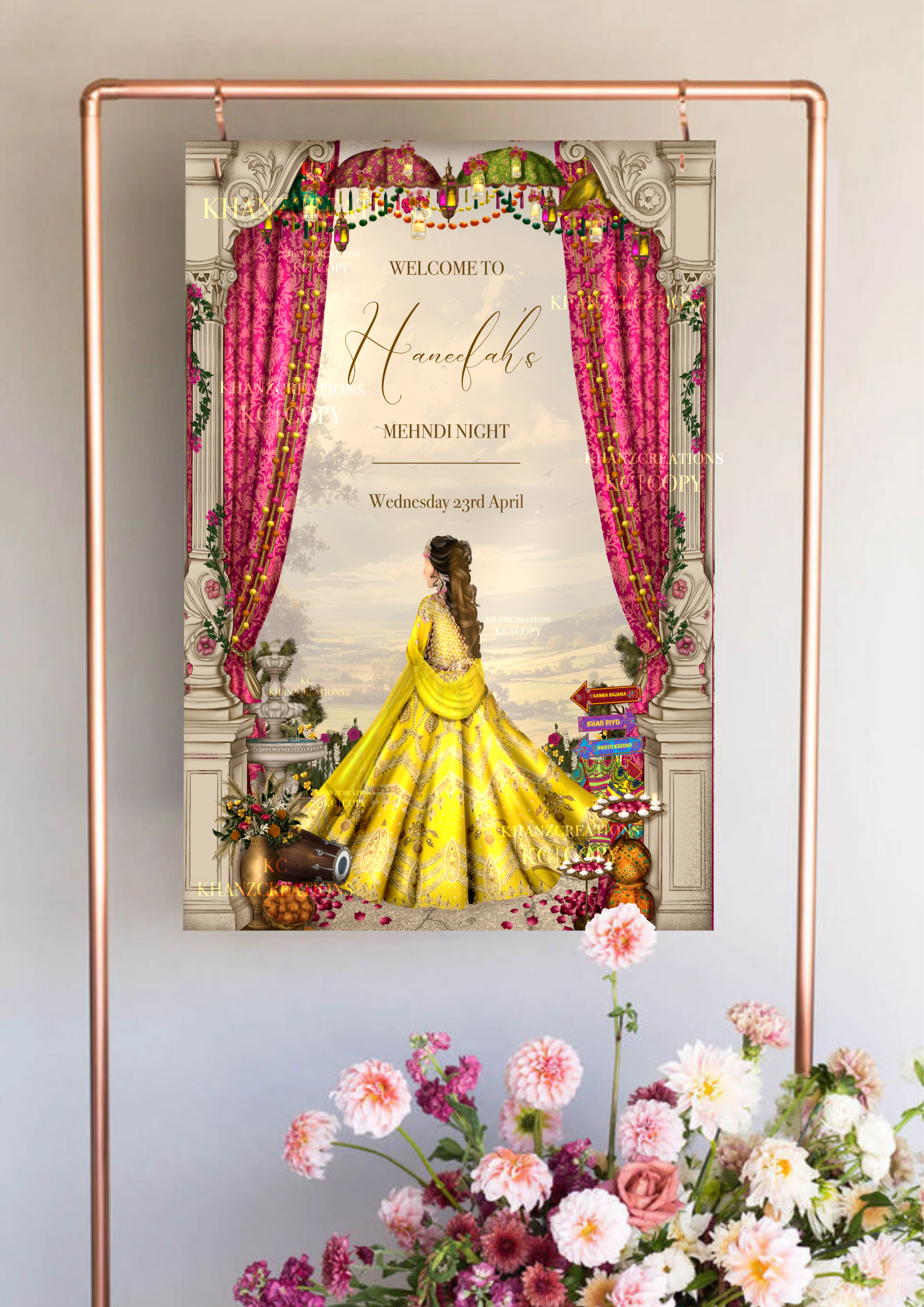 Picture a mehndi welcome board as a magical gateway to a fairytale celebration. It's like a charming storyteller, whispering tales of love and togetherness as you approach. Adorned with vibrant elegant designs, delicate flowers, and shimmering accents, it's a visual masterpiece that sings with romance and enchantment. This captivating board not only greets you but embraces you in the promise of a day filled with magic and unforgettable moments, where every detail whispers of a love story waiting to unfold.