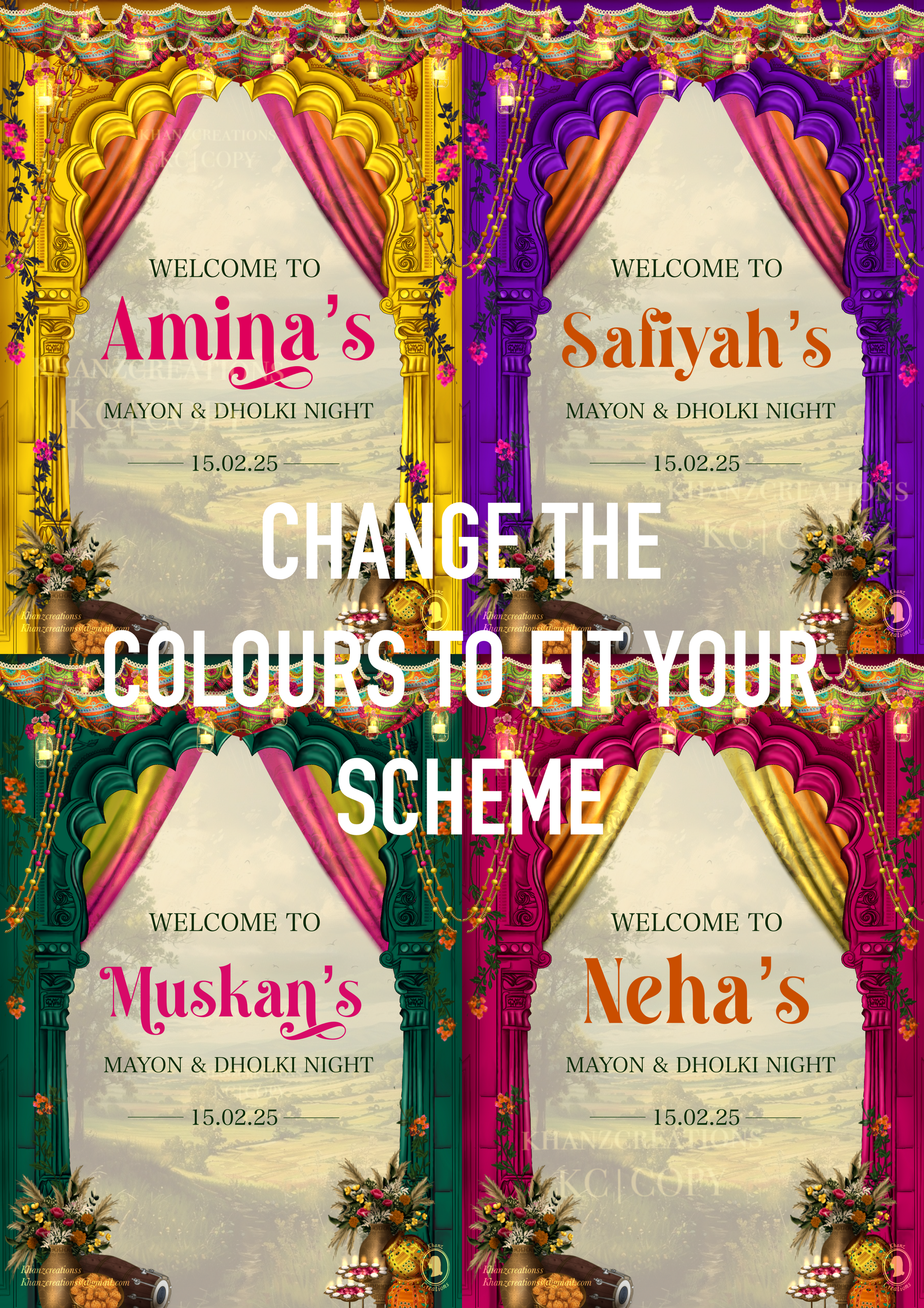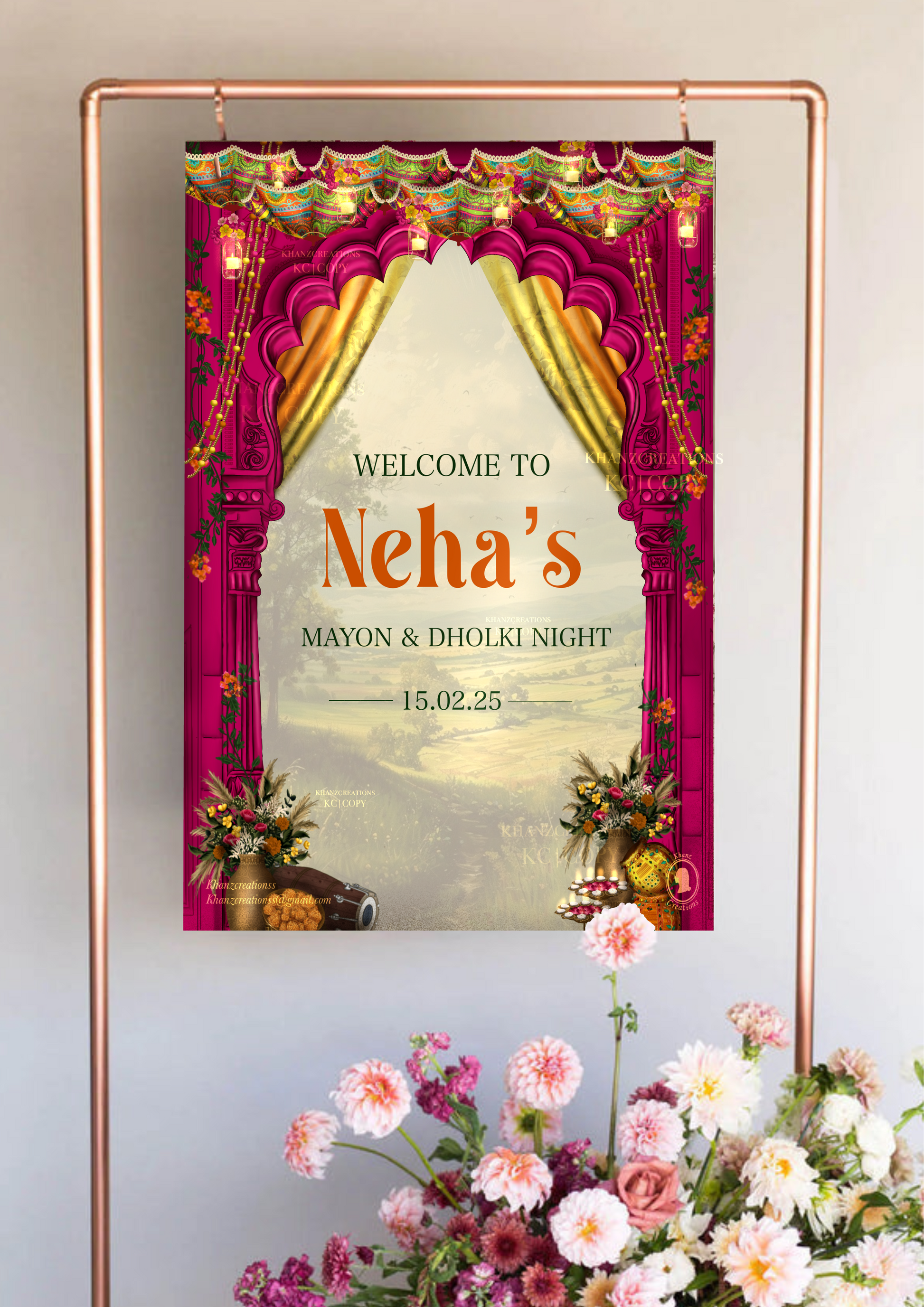 Picture a mehndi welcome board as a magical gateway to a fairytale celebration. It's like a charming storyteller, whispering tales of love and togetherness as you approach. Adorned with vibrant elegant designs, delicate flowers, and shimmering accents, it's a visual masterpiece that sings with romance and enchantment. This captivating board not only greets you but embraces you in the promise of a day filled with magic and unforgettable moments, where every detail whispers of a love story waiting to unfold.
