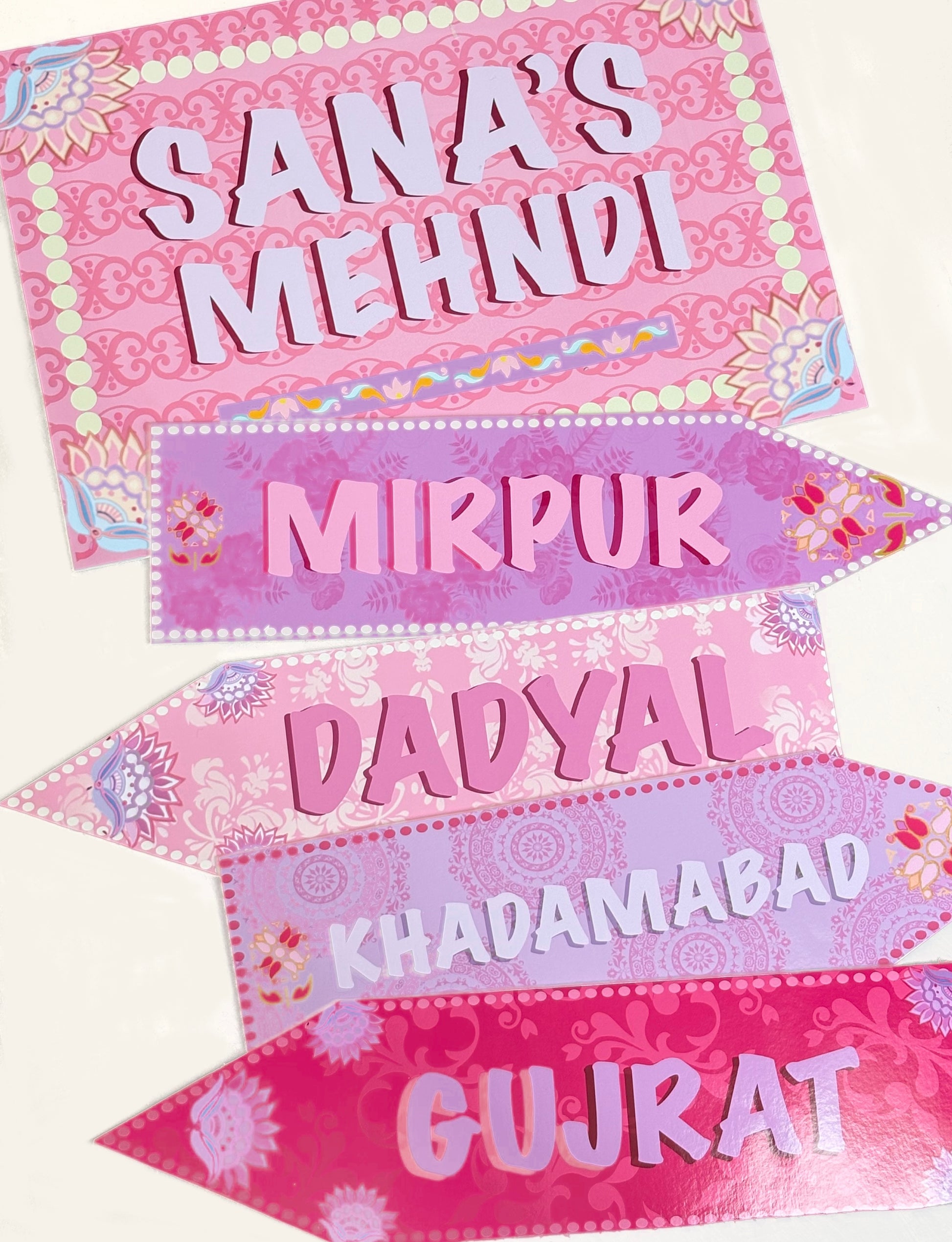 A funky and fun way to entice your guests at your event, wether your going to have them on a pole or even if your going to place them on your table set ups then this is the perfect place to get your arrow signs for your DIY projects, make your mehndi/dholki events cute! Fun! And funky!