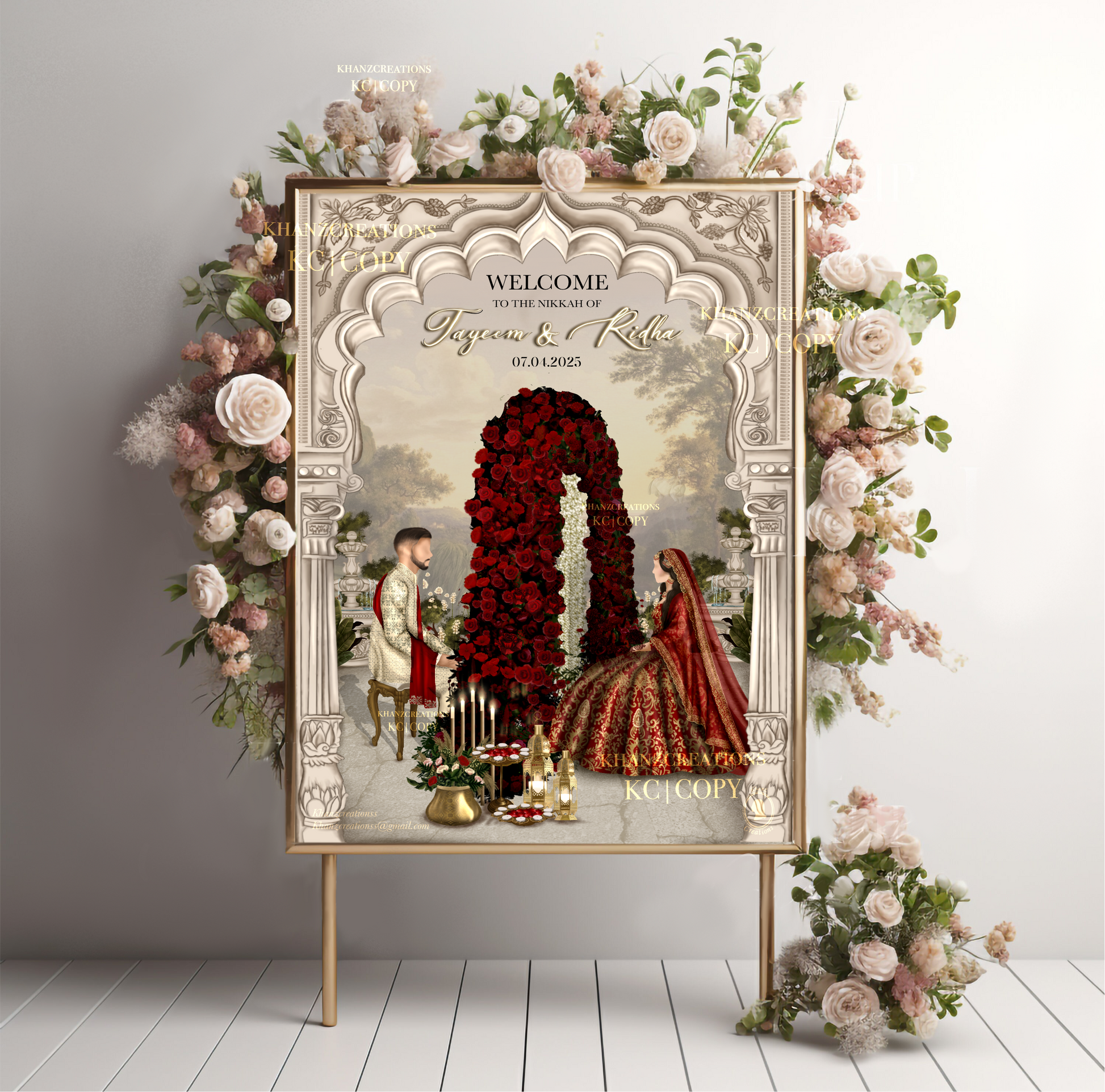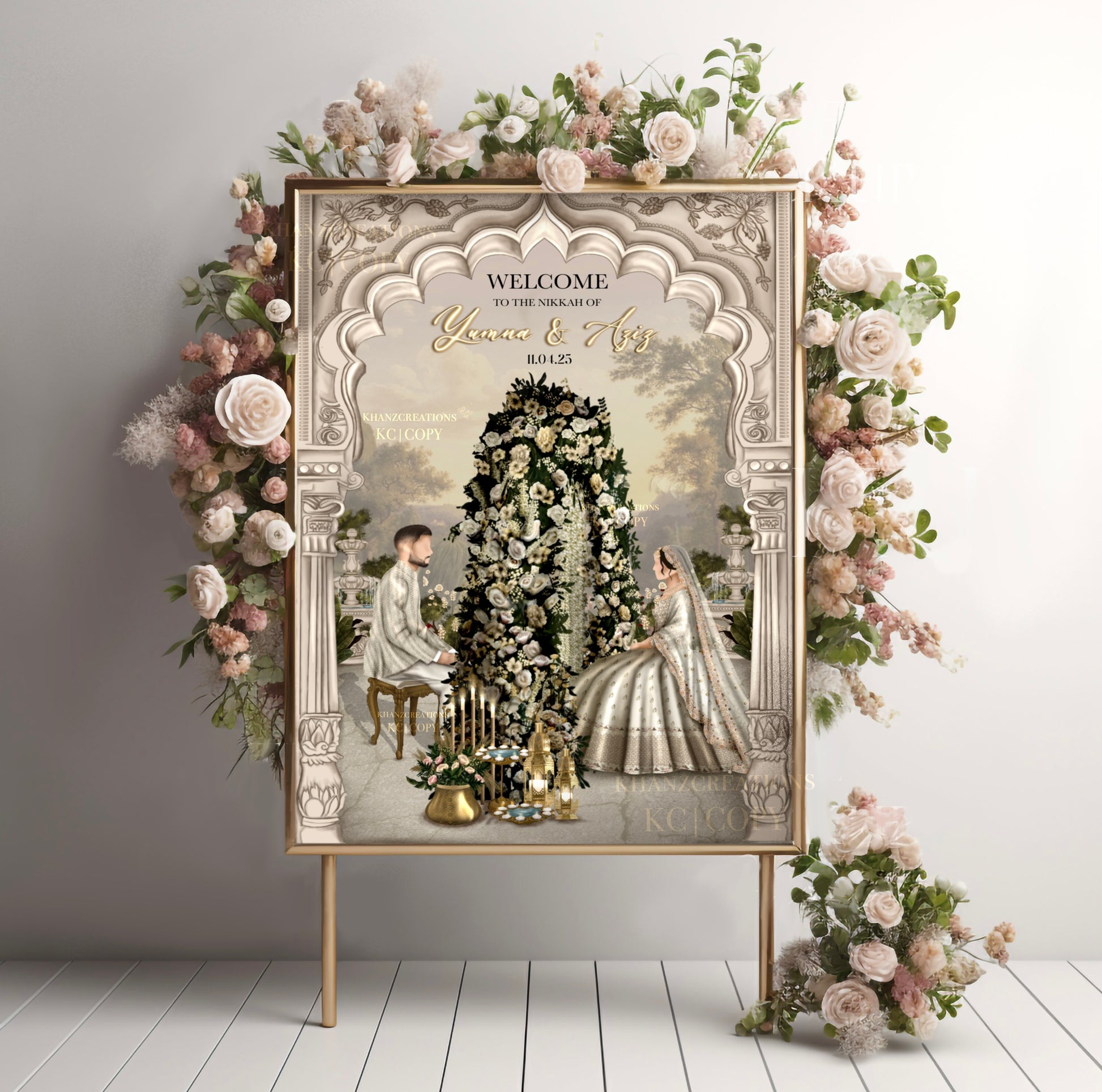 Picture a Nikkah/Wedding welcome board as a magical gateway to a fairytale celebration. It's like a charming storyteller, whispering tales of love and togetherness as you approach. Adorned with vibrant elegant designs, delicate flowers, and shimmering accents, it's a visual masterpiece that sings with romance and enchantment. This captivating board not only greets you but embraces you in the promise of a day filled with magic and unforgettable moments, where every detail whispers of a love story waiting to unfold.