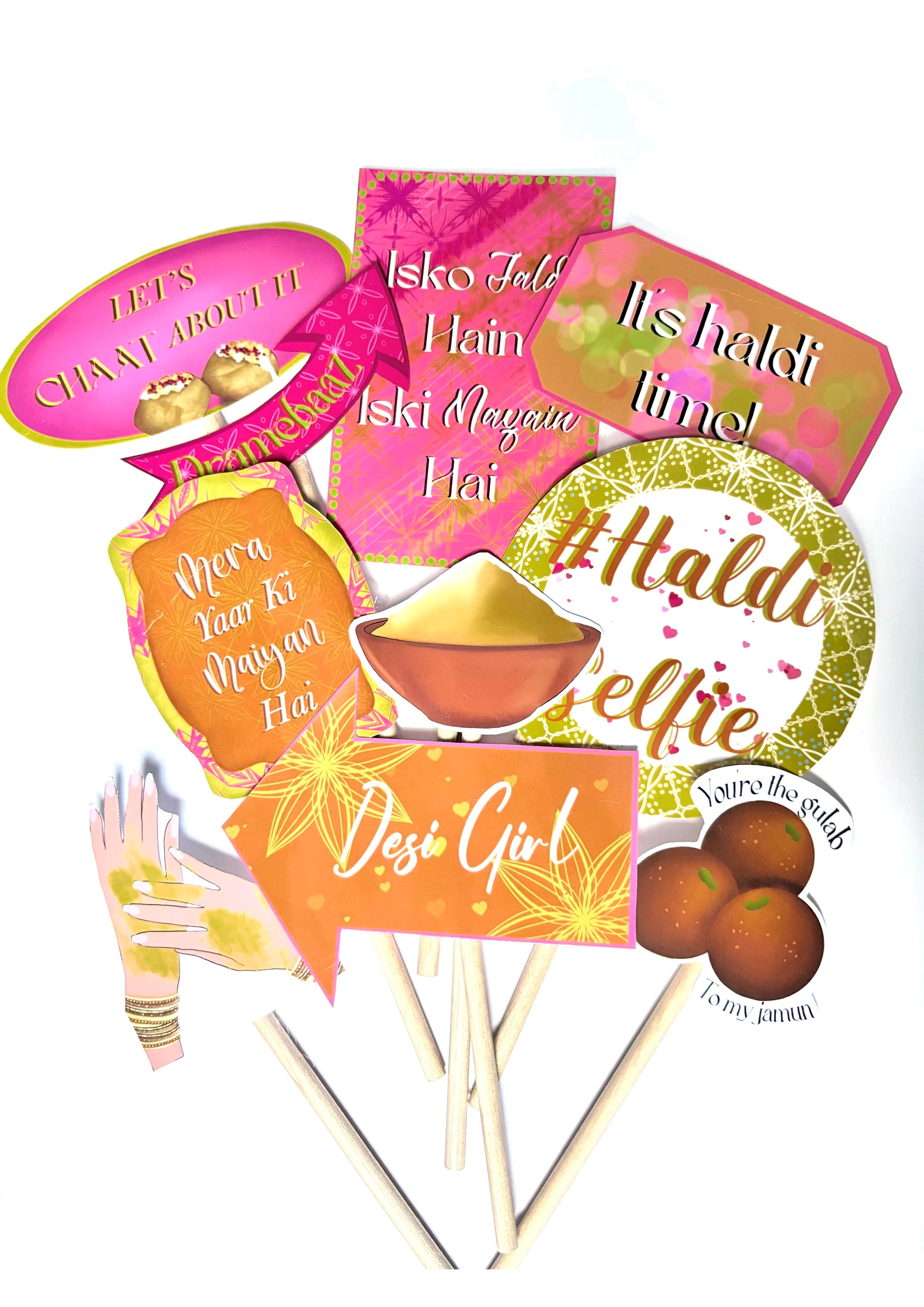 Now introducing our haldi props in a pink/orange/ yellow theme, add to your decor table display them in cool & funky ways to get those guests going & laughing, spruce up those pics ladies & gents for memories that will last a lifetime.