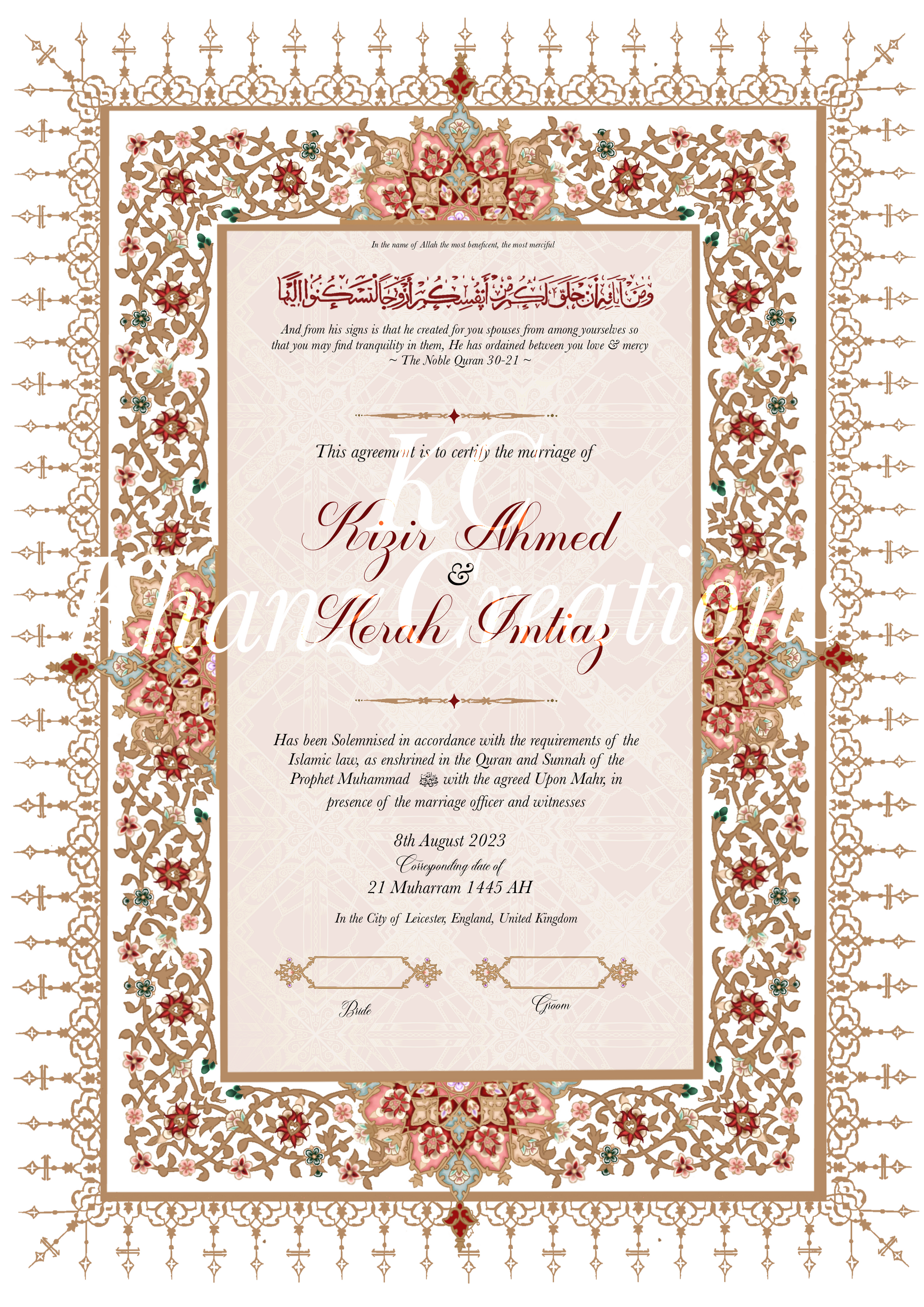 A nikkah certificate, is a sacred testament to the beautiful union of two souls. Picture if you will, an exquisite parchment, bearing the delicate calligraphy and pattern that narrates the promise of a lifetime. Each certificate, a unique masterpiece, a tangible memento of the day when two becomes one.