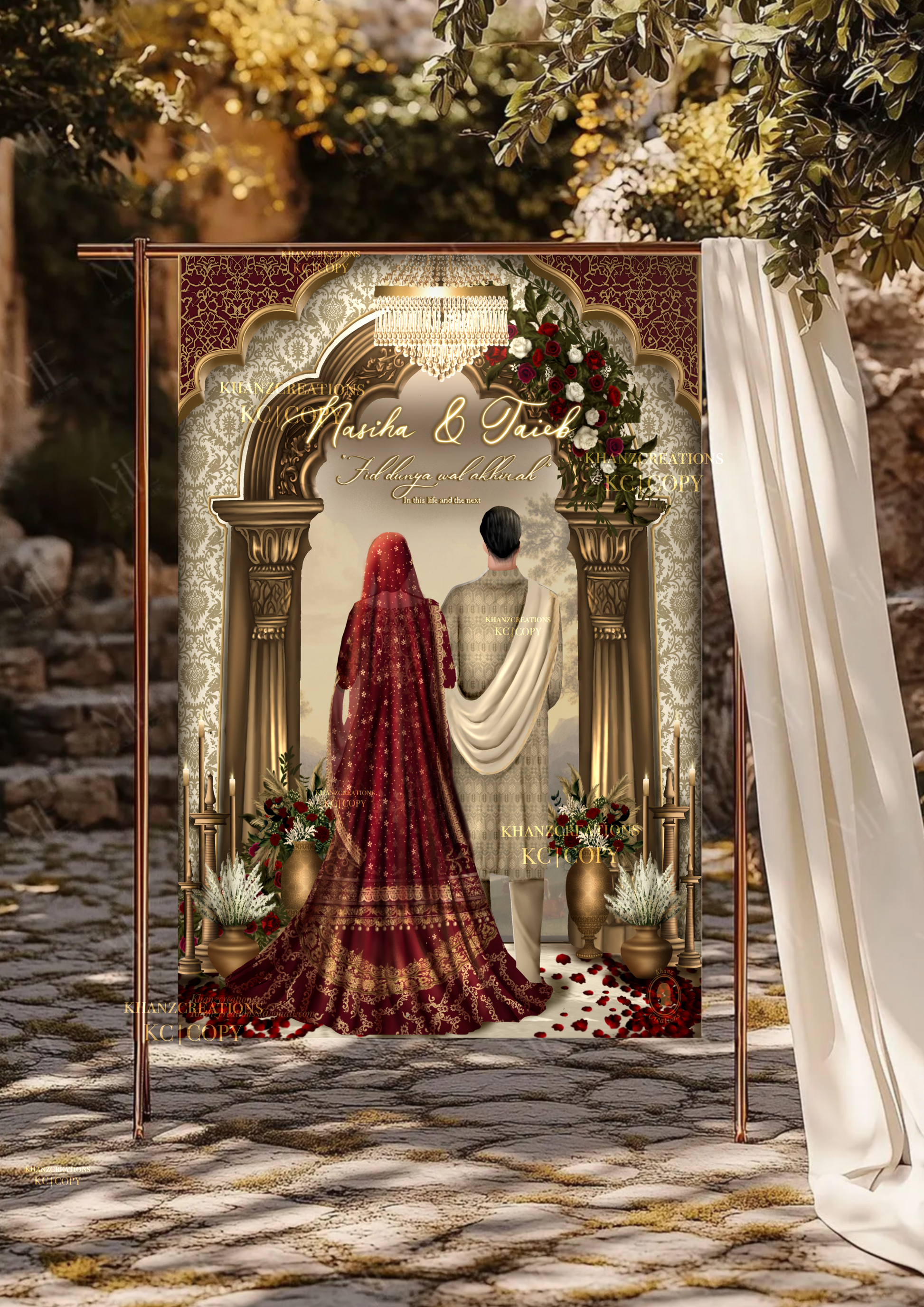 Picture a Nikkah/Wedding welcome board as a magical gateway to a fairytale celebration. It's like a charming storyteller, whispering tales of love and togetherness as you approach. Adorned with vibrant elegant designs, delicate flowers, and shimmering accents, it's a visual masterpiece that sings with romance and enchantment. This captivating board not only greets you but embraces you in the promise of a day filled with magic and unforgettable moments, where every detail whispers of a love story waiting to unfold.