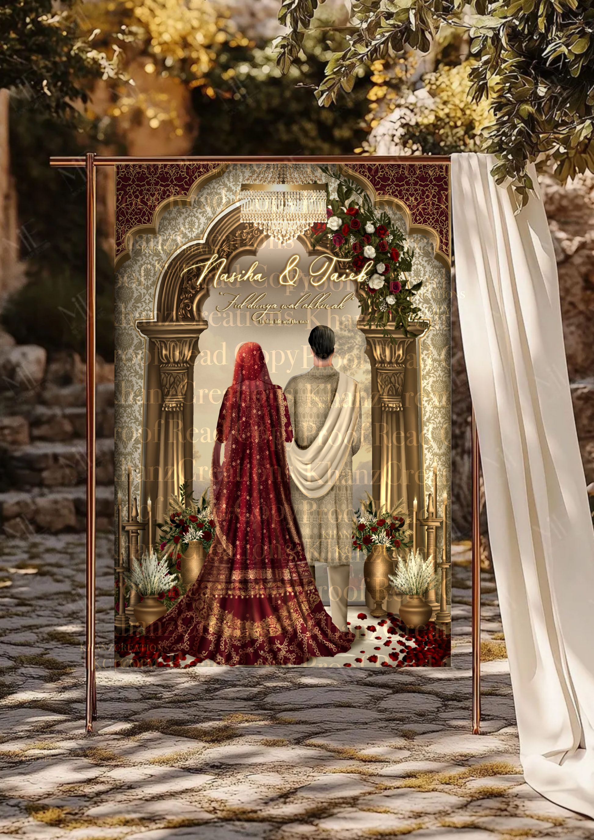 Picture a Nikkah/Wedding welcome board as a magical gateway to a fairytale celebration. It's like a charming storyteller, whispering tales of love and togetherness as you approach. Adorned with vibrant elegant designs, delicate flowers, and shimmering accents, it's a visual masterpiece that sings with romance and enchantment. This captivating board not only greets you but embraces you in the promise of a day filled with magic and unforgettable moments, where every detail whispers of a love story waiting to unfold.