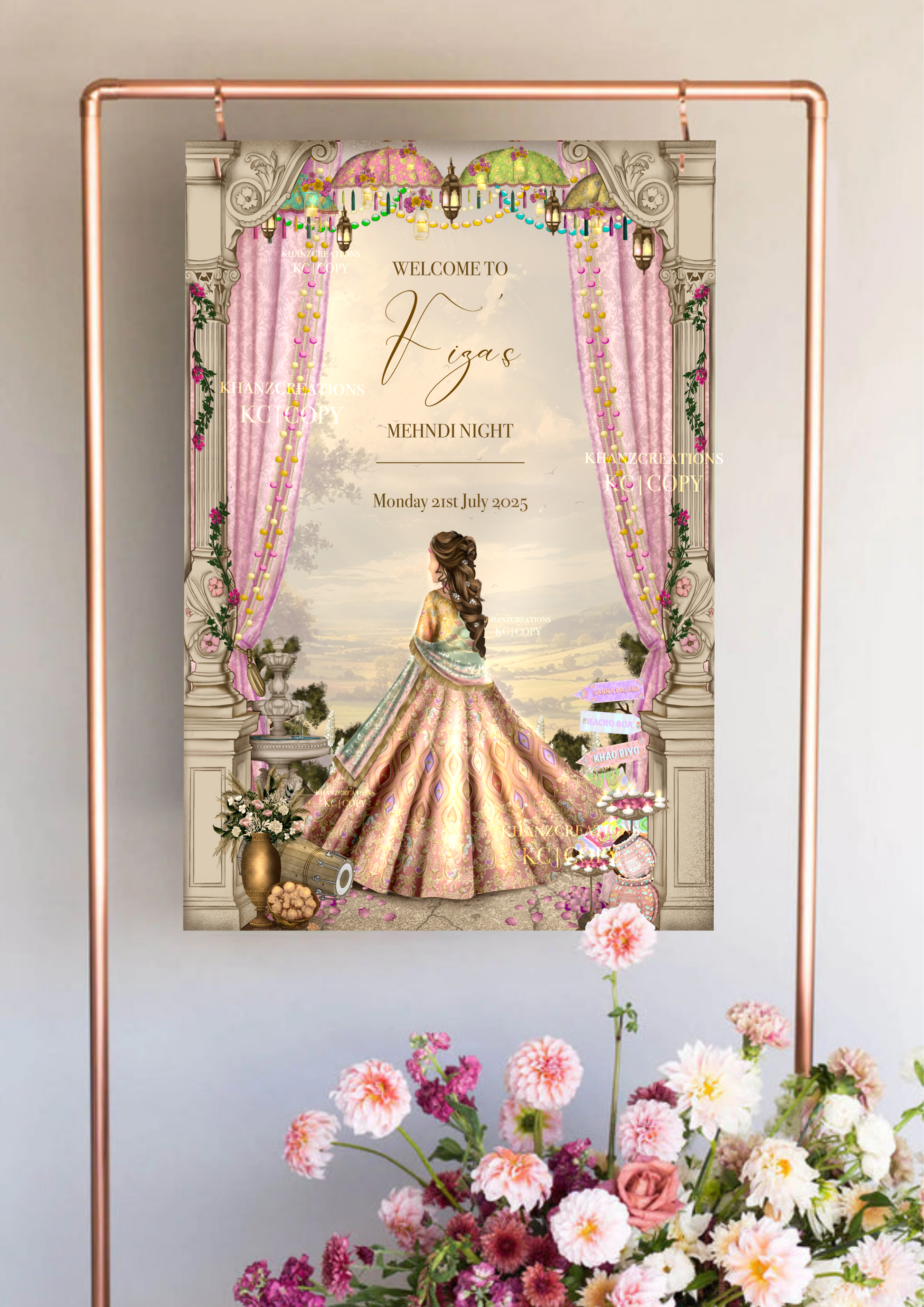 Picture a mehndi welcome board as a magical gateway to a fairytale celebration. It's like a charming storyteller, whispering tales of love and togetherness as you approach. Adorned with vibrant elegant designs, delicate flowers, and shimmering accents, it's a visual masterpiece that sings with romance and enchantment. This captivating board not only greets you but embraces you in the promise of a day filled with magic and unforgettable moments, where every detail whispers of a love story waiting to unfold.