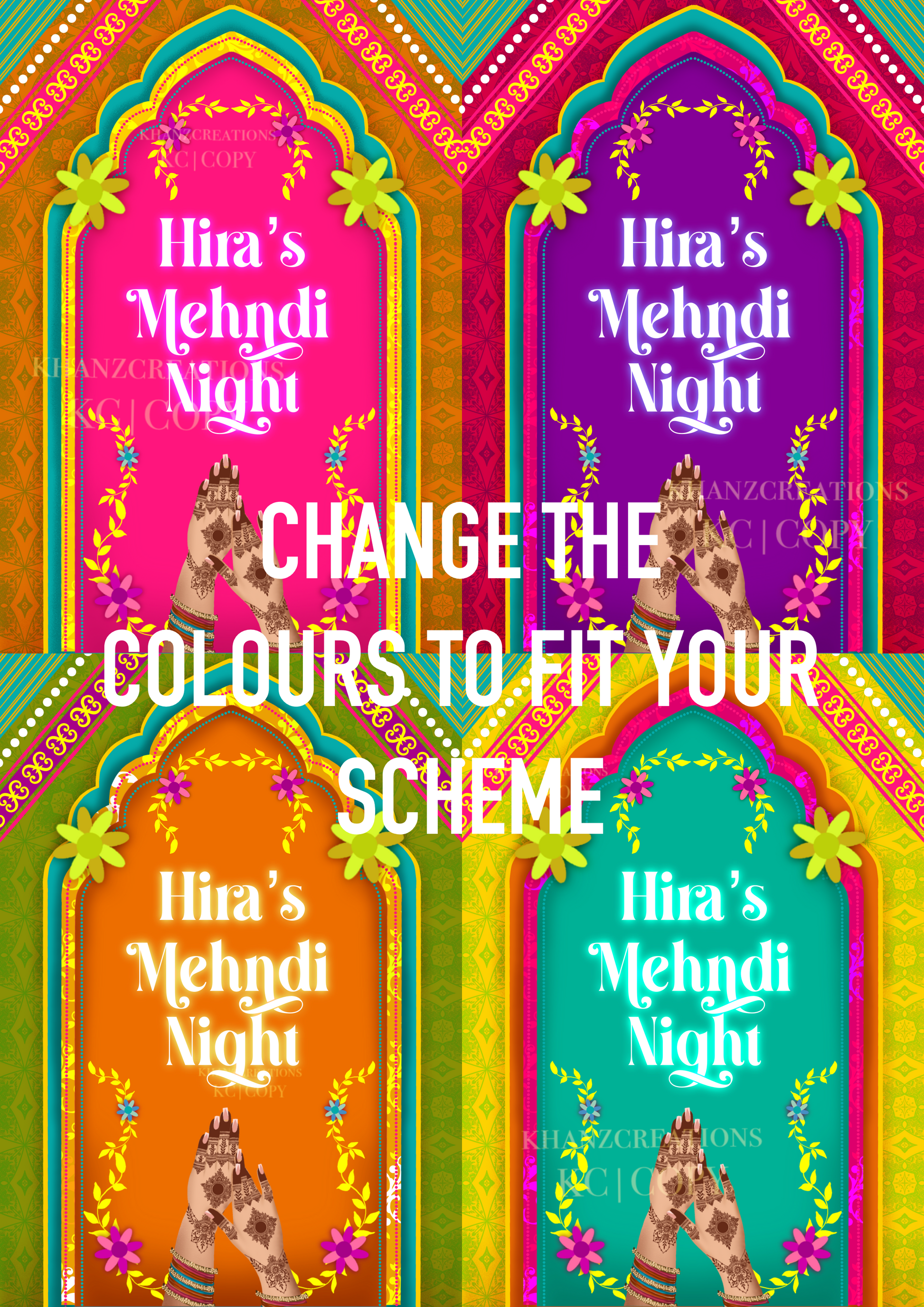 Picture a mehndi welcome board as a magical gateway to a fairytale celebration. It's like a charming storyteller, whispering tales of love and togetherness as you approach. Adorned with vibrant elegant designs, delicate flowers, and shimmering accents, it's a visual masterpiece that sings with romance and enchantment. This captivating board not only greets you but embraces you in the promise of a day filled with magic and unforgettable moments, where every detail whispers of a love story waiting to unfold.