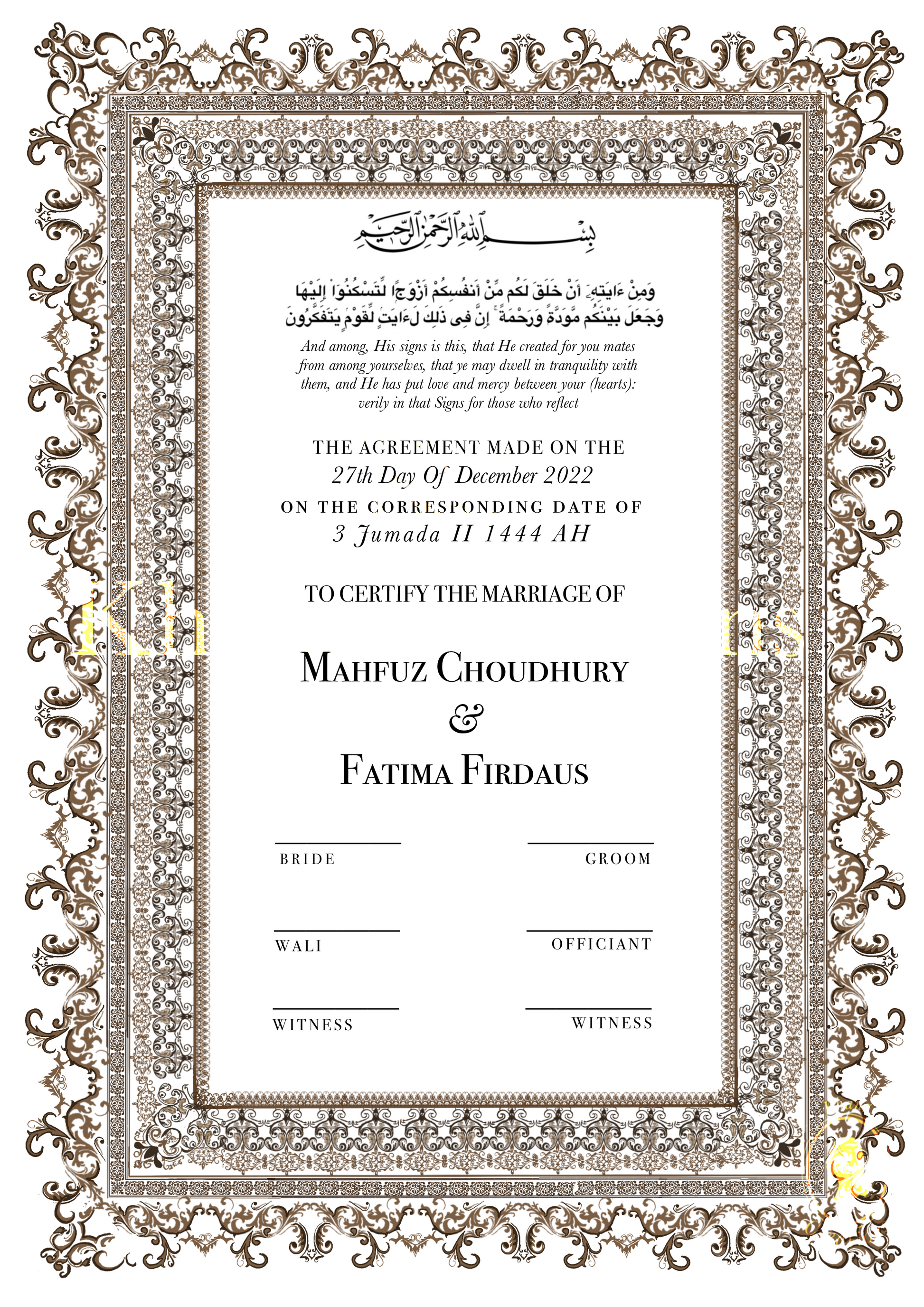 A nikkah certificate, is a sacred testament to the beautiful union of two souls. Picture if you will, an exquisite parchment, bearing the delicate calligraphy and pattern that narrates the promise of a lifetime. Each certificate, a unique masterpiece, a tangible memento of the day when two becomes one.