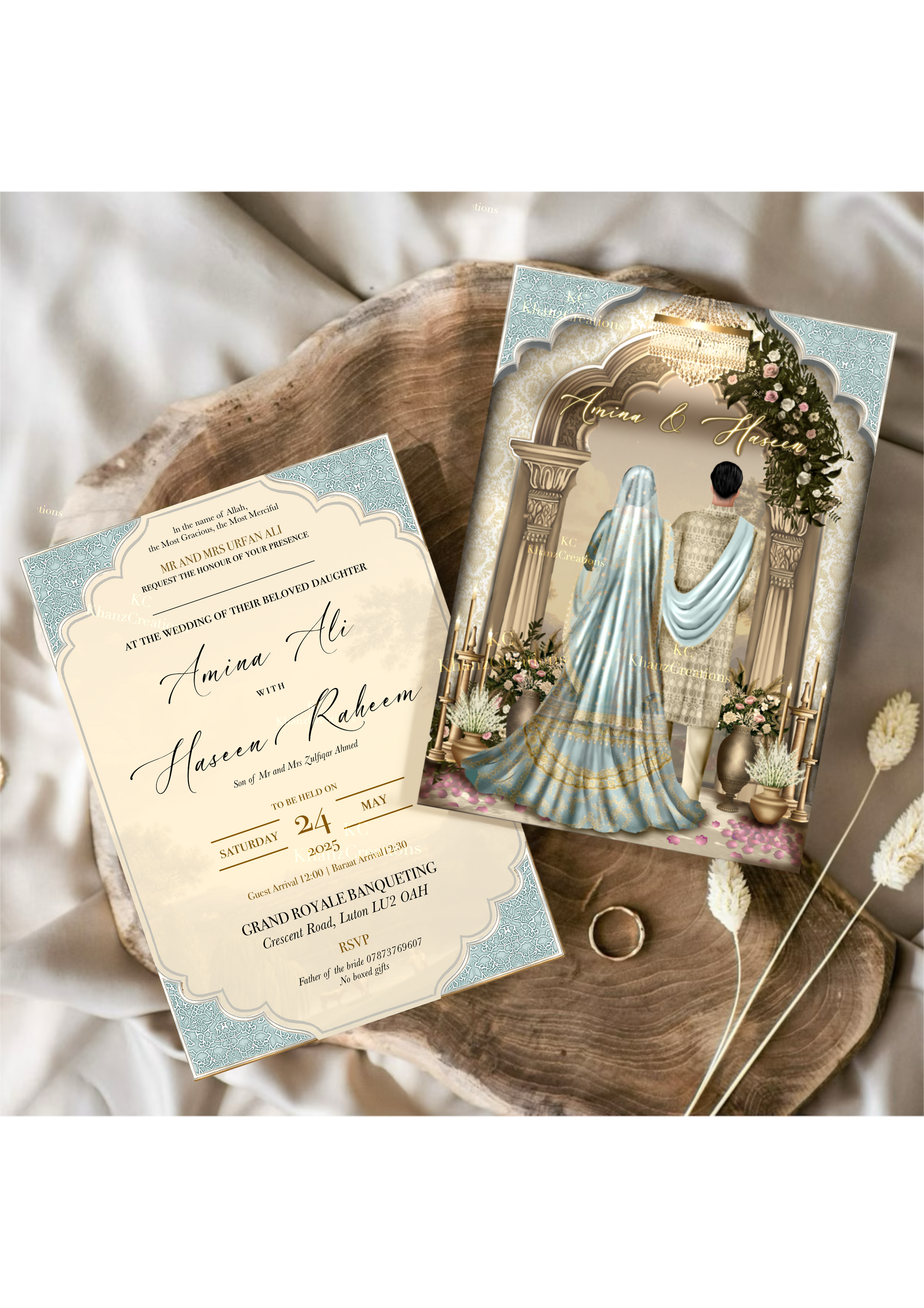 Announce your vibrant union with these captivating invitations, where intricate artistry meets cultural richness. A bespoke illustration inspired by South Asian motifs graces the front, whispering tales of your special day. Printed on luxurious silk paper, each invitation is a keepsake, promising an event as magical as your dreams. A proof will be provided, but the ultimate responsibility for accuracy lies with you.