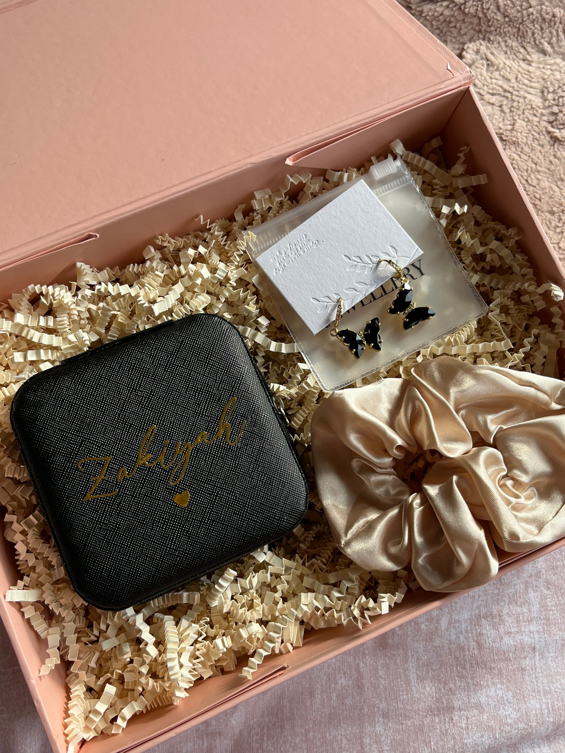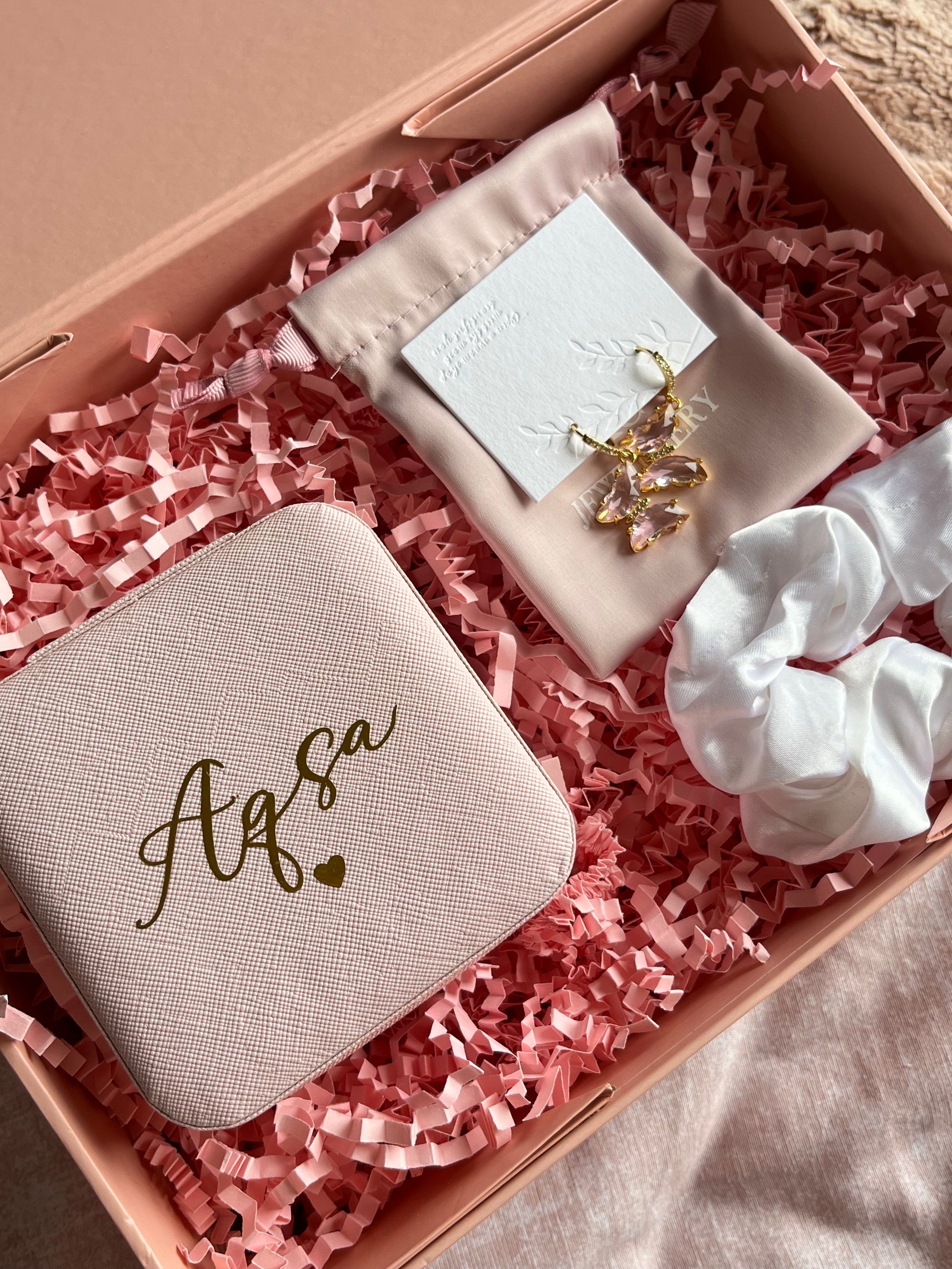 take a look into our very pink treasure box, swoon over our personalised leather jewellery box with your name written in gleaming gold, the most beautiful earrings and a little scrunchie to tiel it altogether, pun intended.